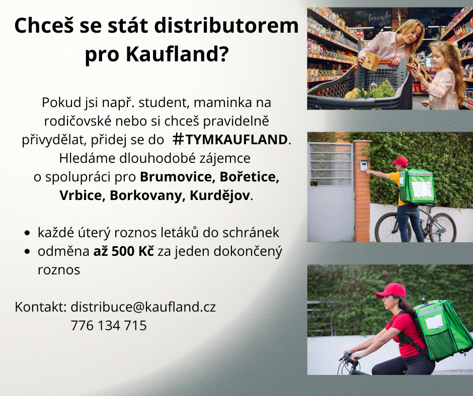 Společnost Kaufland hledá nové distributory reklamních materiálů pro území: Brumovice, Borkovany, Bořetice, Vrbice. V případě zájmu více informací na tel. 776 134 715. Těšíme se na spolupráci.